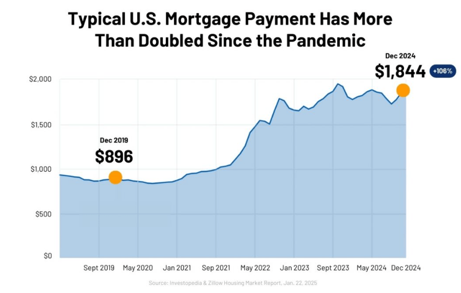 According to data from the U.S. Census Bureau, home prices have risen around 32% since the pandemic, and elevated mortgage rates have caused monthly payments to balloon.