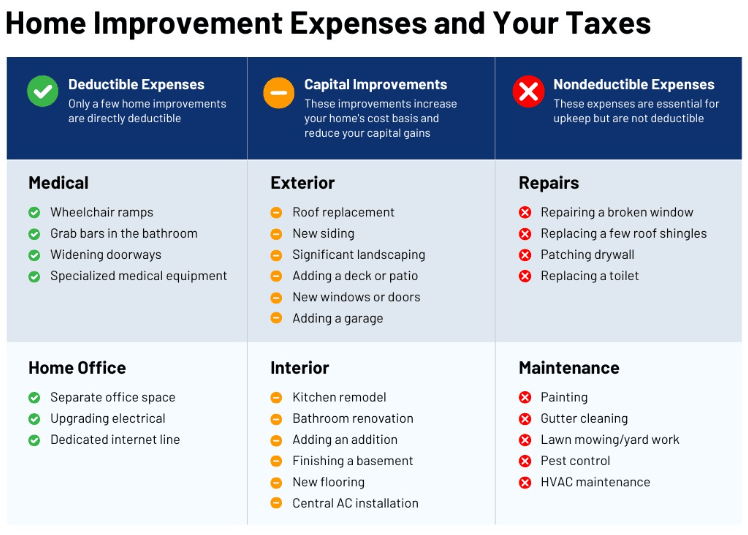 Beyond capital improvement, there are a few specific categories of home improvement that are deductible, including work on home offices (which is subject to specific limitations) and certain modifications for medical/accessibility reasons.